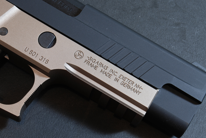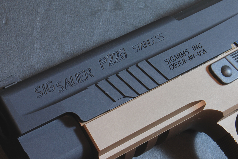 PGC原廠刻印還是略有不同,畢竟它是標準P226構型,現在美版出廠的P226都已經是像E2那樣的刻字了,不過我還是喜歡複雜一點的字型