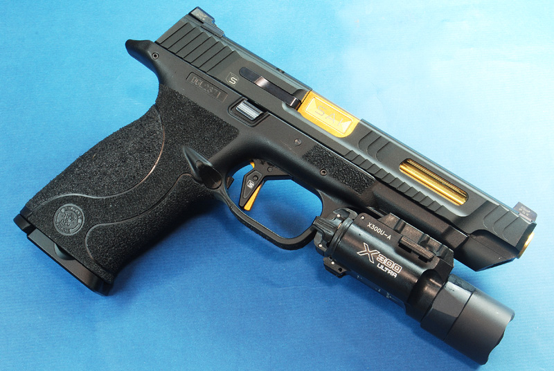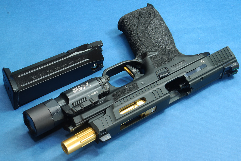 目前市場上的M&P 9就屬WE跟MARUI兩家GBB為主,而改裝套件還是以WE為大宗,這款SAI M&P 9五吋滑套為韓國DETONATOR出品,是目前較為高端市場的套件,當然配件也對得起售價,雖說滑套本體為鋁合金,但是所附的照門、拋殼勾、後定擋板都是鋼製品,配合WE的大氣缸系統,打起來也是輕快又有力!