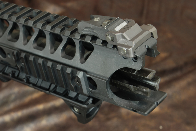 為了搭配1-4X狙擊鏡,照門組自然不能選用TORY款,這隻選用KAC MICRO照準組。
