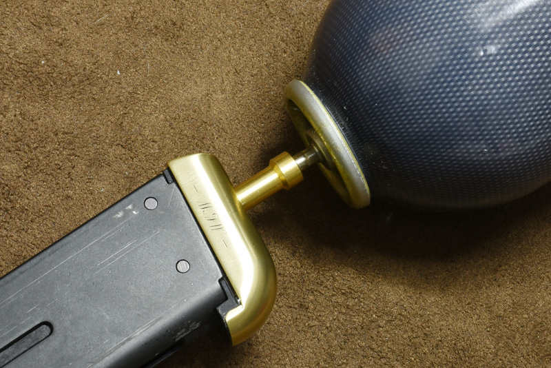 由於加厚彈匣底板,灌氣需要內附的專用轉接頭,這東西相當好用!平常亦可使用一般MARUI彈匣!